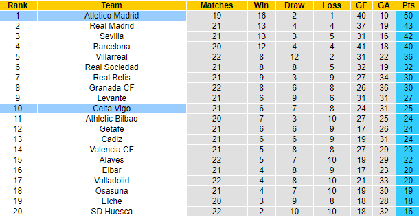 Atletico Madrid đang hoàn toàn vượt trội so với Celta Vigo. Trên bảng xếp hạng La Liga 2020/21, Atletico Madrid đang dẫn đầu với 50 điểm sau 19 trận, hơn đội xếp thứ 2 Real Madrid 7 điểm dù đá ít hơn 2 trận. Trong khi đó Celta Vigo mới giành được 25 điểm sau 21 trận. Thế nhưng dù được chơi trên sân nhà, Atletico Madrid vẫn bị nghi ngờ chiến thắng ở trận đấu sắp tới.