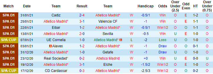 + Thống kê 10 trận gần nhất của Atletico Madrid