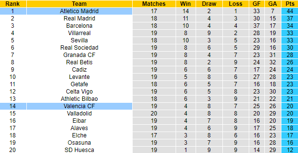 Trên bảng xếp hạng La Liga 2020/21, Atletico Madrid đang chễm chệ ở vị trí số 1 với 44 điểm sau 17 trận. Họ hơn đội xếp thứ 2 Real Madrid 7 điểm dù đá ít hơn 1 trận. Trong khi đó Valencia sau 19 trận mới giành được 20 điểm, xếp thứ 14 trên BXH. 6 vòng đấu gần đây tại giải VĐQG Tây Ban Nha, Atletico Madrid toàn thắng, 5 trận họ xé lưới đối thủ từ 2 lần trở lên.