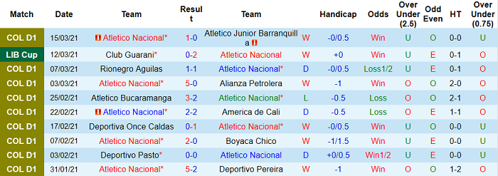 - Thống kê 10 trận gần nhất của Atletico Nacional