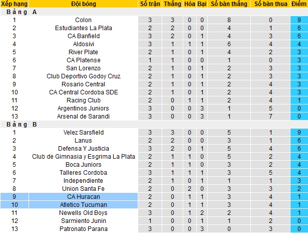 Bảng xếp hạng giải VĐQG Argentina vòng 3