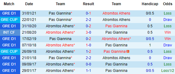+ Lịch sử đối đầu Atromitos vs PAS Giannina