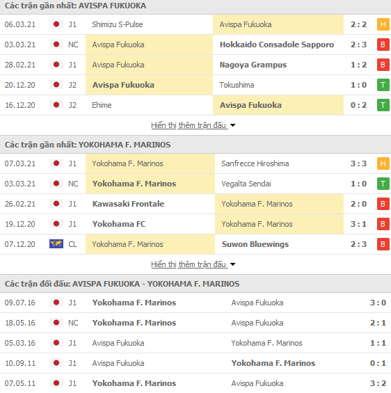 Phong độ và thống kê đối đầu gần đây Avispa Fukuoka vs Yokohama Marinos: