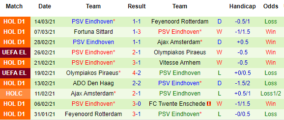 + Thống kê 10 trận gần nhất của PSV Eindhoven