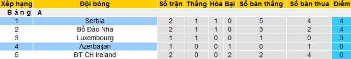 Trong khi đó Serbia đang tạm dẫn đầu bảng A với 4 điểm sau 2 lượt trận đầu tiên. Serbia đang có cùng điểm số với Bồ Đào Nha nhưng xếp trên nhờ hơn về chỉ số phụ, nhưng cũng chỉ hơn đội thứ ba Luxembourg đúng 1 điểm.