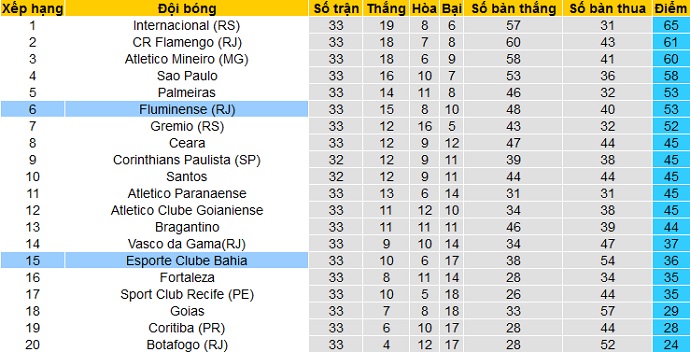 Bahia vẫn đang phải đối diện với nguy cơ xuống hạng khi hiện tại đội bóng chỉ đang đứng thứ 15 trên bảng xếp hạng, trên nhóm các cầm đội đèn đỏ 2 bậc. Với 36 điểm có được sau 33 vòng đấu, Bahia cũng chỉ đang hơn nhóm cầm đèn đỏ đúng 1 điểm trong khi giải chỉ còn 5 vòng đấu nữa.