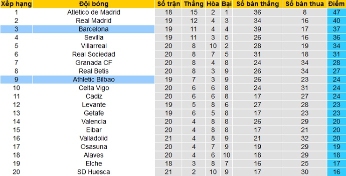 Trong khi đó Athletic Bilbao lại chỉ đang đứng thứ 9 tại La Liga với 24 điểm cũng sau 19 vòng đấu. Khoảng cách của Athletic Bilbao đến nhóm các đội Top 6, có suất dự cúp châu Âu đang là 7 điểm.