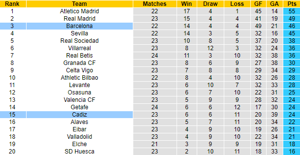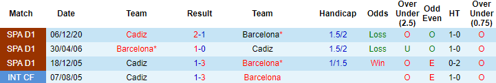 Phong độ và thống kê đối đầu Barcelona vs Cadiz