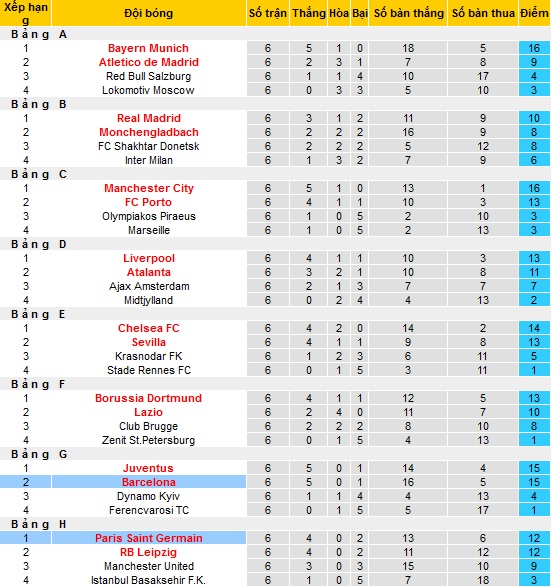 Xếp hạng vòng bảng cúp C1 châu Âu