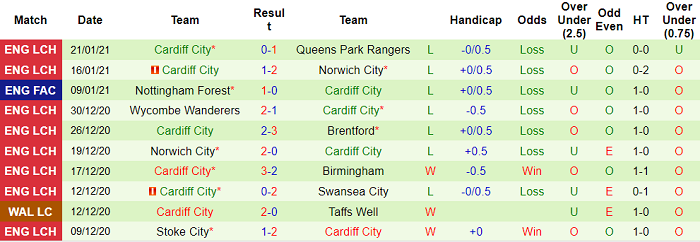 - Thống kê 10 trận gần nhất của Cardiff