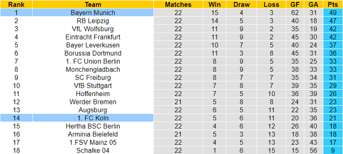 Các cầu thủ dưới trướng HLV Hansi Flick thừa hiểu rằng nếu thất bại trước Koln, họ có thể phải trả giá bằng chính vị trí đầu bảng. Bayern Munich dĩ nhiên cần đánh bại Koln để khẳng định vị thế đồng thời sẵn sàng cho chặng đường còn lại của mùa giải.