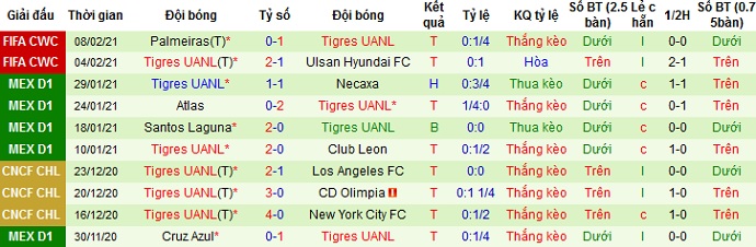 + Thống kê 10 trận gần nhất của Tigres UANL