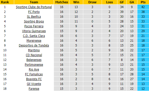 BẢNG XẾP HẠNG GIẢI VĐQG BỒ ĐÀO NHA