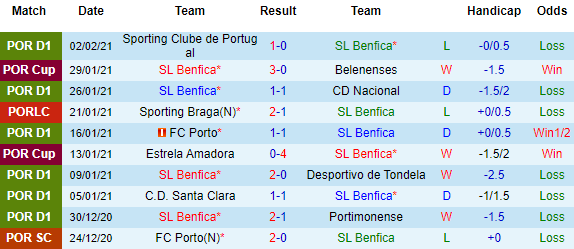 + Thống kê 10 trận gần nhất của Benfica