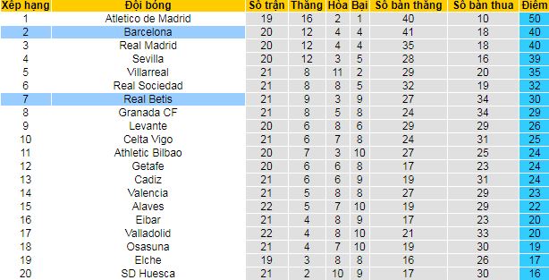 Bên kia sân, đội chủ nhà Real Betis cũng đã bất bại cả 5 trận gần nhất của mình với 3 chiến thắng và 2 trận hòa. Mang về đến 11 điểm, đội bóng đến từ Andalusia leo nhanh trên bảng xếp hạng và áp sát nhóm dự cúp châu Âu với chỉ 2 điểm ít hơn. Tuy vậy, trong 4 lần gần nhất đụng độ Barcelona, Betis lại không giành nổi chỉ 1 điểm.