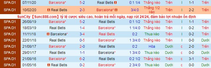 + Lịch sử đối đầu Betis vs Barcelona