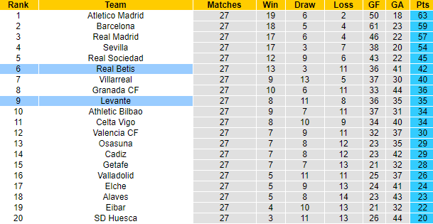 Lúc này, Betis cũng đang rất tự tin với phong độ vào phom nhờ lực lượng ổn định. 5 vòng đấu gần đây trong khuôn khổ La Liga, Betis giành 12 trên 15 điểm tối đa. Trên bảng xếp hạng, Betis đã vươn lên xếp thứ 6 với 42 điểm sau 27 trận, chỉ kém đội xếp trên Sociedad 3 điểm. Trong khi đó Levante giai đoạn gần đây có dấu hiệu sa sút với 3 trên 4 trận không thể thắng.