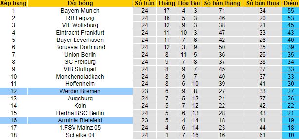 Đối thủ tiếp theo của đội bóng này sẽ là một Werder Bremen được đánh giá cao hơn về trình độ và cũng đang có phong độ không tồi. Đội khách hiện xếp trên 4 bậc so với Bielefeld.7 trận gần nhất trên mọi đấu trường Werder Bremen chỉ phải nhận duy nhất 1 thất bại, còn lại thắng 3 hoà 3.