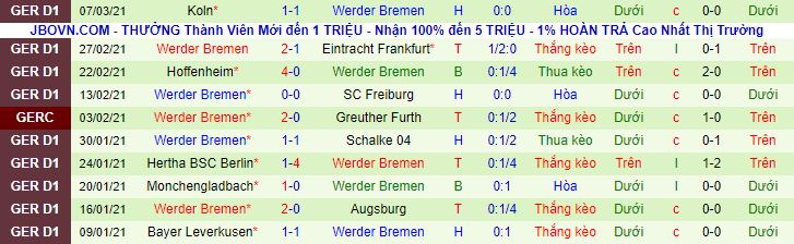 + Thống kê 10 trận gần nhất của Werder Bremen