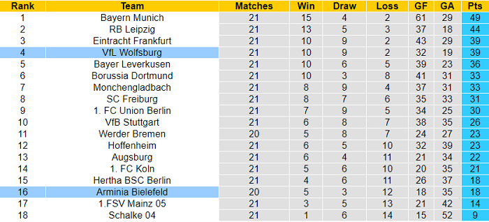 Khả năng ghi bàn của Bielefeld ở trận này không cao vì Wolfsburg thời gian gần đây phòng ngự tốt trên sân khách. Đã 3 trận sân khách vừa qua thuộc khuôn khổ Bundesliga, Bầy Sói không phải nhận bàn thua.
