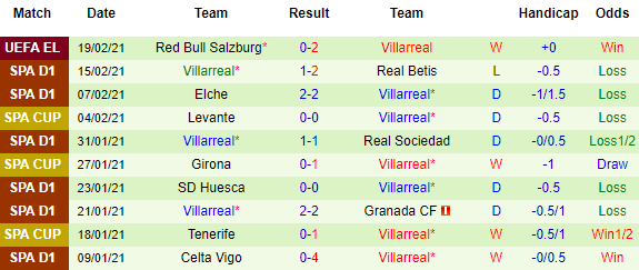 + Thống kê 10 trận gần nhất của Villarreal