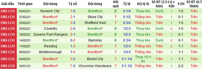 + Thống kê 10 trận gần nhất của Brentford