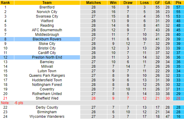 Tuy vậy thì vào thời điểm hiện tại, Preston North End cũng không thua kém Blackburn là bao. Trên BXH, nếu như Blackburn có vị trí thứ 8 thì Preston dẫu đứng thứ 12 cũng chỉ kém có 3 điểm, nhưng nên nhớ là Blackburn thi đấu ít hơn Preston 1 điểm.