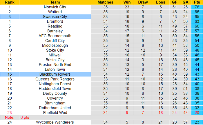 Về thành tích, Swansea thu về 65 điểm sau 33 trận trong khi Blackburn chỉ có được 43 điểm dù đã thi đấu tới 34 trận. Blackburn về cơ bản không còn động lực còn Swansea vẫn cạnh tranh một trong hai suất thăng hạng trực tiếp với Norwich, Watford và Brentford.