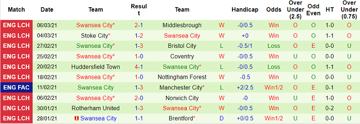 Swansea là chuyên gia thắng kèo của Championship mùa này. Tỷ lệ thắng kèo của Swansea tại Championship 2020/21 lên tới 66.67%, cao nhất toàn giải. Thiên nga hứa hẹn tiếp tục mang về niềm vui cho các cổ động viên cũng như giới đầu tư.
