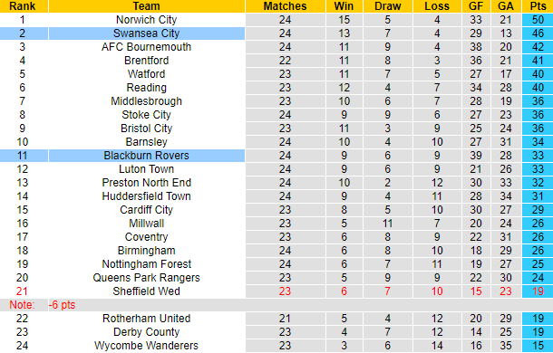 6 trận gần đây Swansea thắng 5, hòa 1. Trên bảng xếp hạng Championship, Thiên nga đen đã vươn lên xếp thứ 2 với 46 điểm sau 24 trận. Trong khi đó Blackburn mới giành được 33 điểm, xếp ở vị trí thứ 11. 6 trận gần đây Blackburn thua 3, hòa 1 và chỉ thắng được 1 trận. Đội hình sứt mẻ với 7 trụ cột chấn thương, Blackburn khó hứa hẹn thoát thua trước Swansea đang vào phom.
