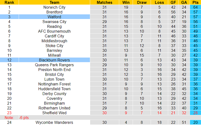 Watford hứa hẹn khiến cuộc khủng hoảng về mặt phong độ của Blackburn thêm phần trầm trọng. Watford đơn giản sở hữu dàn cầu thủ có phần chất lượng hơn lại không hề e ngại đối thủ từng vô địch Premier League vào thế kỷ trước.