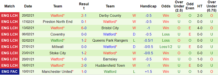 - Thống kê 10 trận gần nhất của Watford