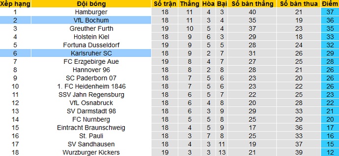 Bảng xếp hạng giải hạng nhì Đức vòng 19