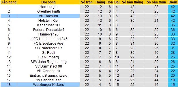 Sau trận thua trước Erzgebirge Aue ở vòng đấu vừa qua, Bochum vẫn đang đứng thứ nhì trên bảng xếp hạng của giải đấu nhưng hiện đã bằng điểm với cả 2 đội đứng sau. Hiện tại cả 4 đội dẫn đầu của giải đang cùng có được 42 điểm sau 22 vòng đấu và chỉ phân thứ hạng nhờ vào hơn kém về hiệu số bàn thắng.