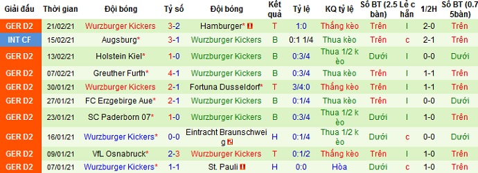 Tuy nhiên ở 5 trận đấu gần đây Würzburger Kickers cũng có được 2 trận thắng và để thua 3 trận. Trên sân khách thành tích của Würzburger Kickers vẫn đang rất tệ khi đội bóng để thua trong cả 5 lần du đấu gần nhất.