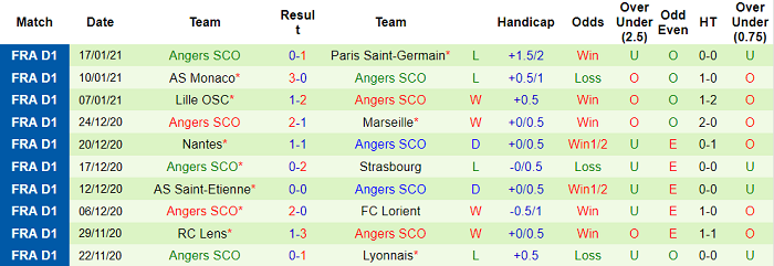 - Thống kê 10 trận gần nhất của Angers