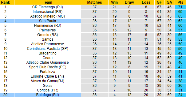 Là tên tuổi giàu truyền thống nhưng Botafogo RJ chơi rất tệ ở mùa bóng năm nay và họ đã chắc chắn xuống hạng. 2 vòng đầu cuối với Botafogo chỉ còn mang ý nghĩa thủ tục. Nhưng với Sao Paulo thì mọi chuyện vẫn chưa kết thúc khi họ vẫn cần điểm để giữ vững thứ hạng trong top 4 của mình.