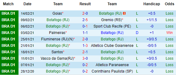 + Thống kê 10 trận gần nhất của Botafogo