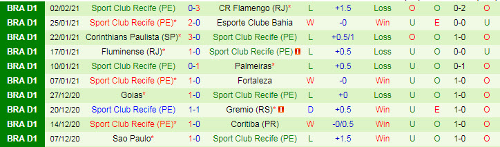+ Thống kê 10 trận gần nhất của Sport Recife
