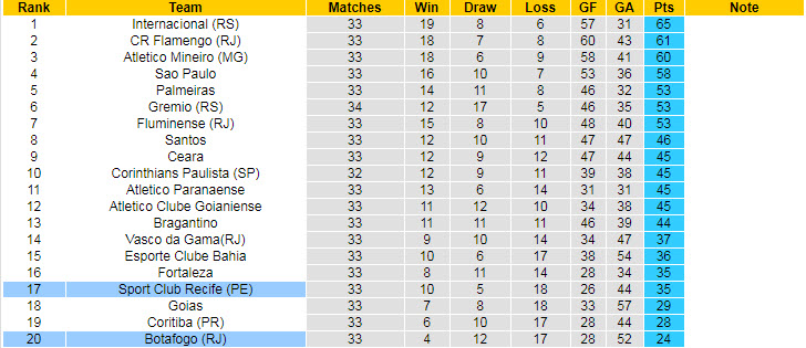 Bảng xếp hạng VĐQG Brazil vòng 34