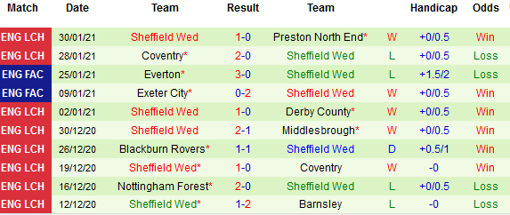 + Thống kê 10 trận gần nhất của Sheffield Wed