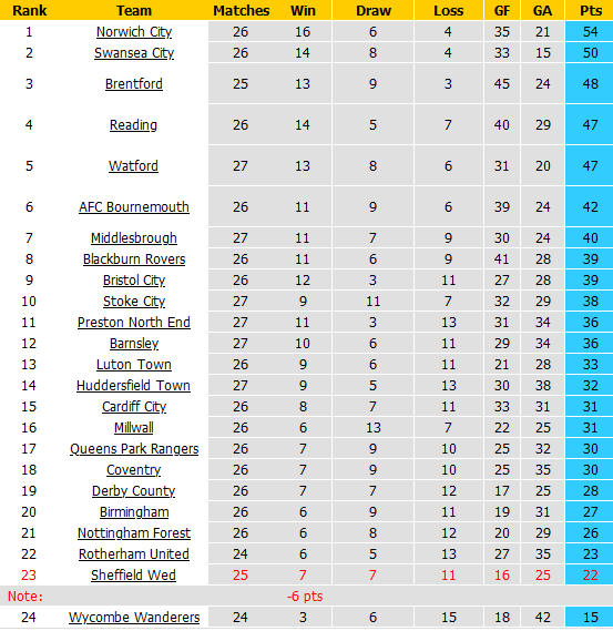 Bournemouth vẫn đua tranh tấm vé thăng hạng khi họ đang đứng thứ 6 với 42 điểm sau 26 trận đã đấu. Khoảng cách với nhóm dẫn đầu không quá xa để Bournemouth bắt kịp khi mùa giải vẫn còn rất dài phía trước.