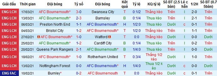 + Thống kê 10 trận gần nhất của Bournemouth