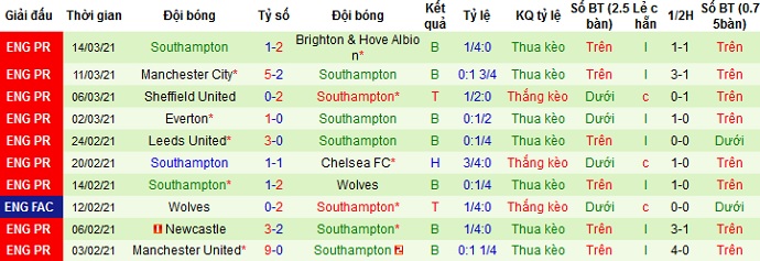 + Thống kê 10 trận gần nhất của Southampton