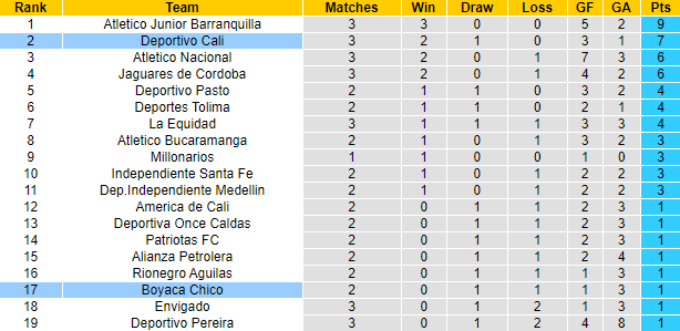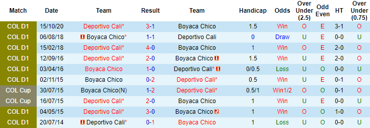 Boyaca Chico có thành tích đối đầu khá tốt trước Deportivo Cali khi có lợi thế về mặt sân bãi. 11 lần làm khách trước đây trên sân của Boyaca Chico, Deportivo Cali để mất điểm 9 lần với 7 thất bại và 2 trận hòa. Tuy nhiên ở trận đấu sắp tới, Boyaca Chico không hứa hẹn có điểm.