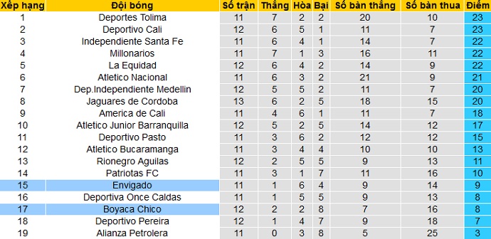 Bảng xếp hạng giải VĐQG Colombia vòng 12