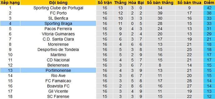 Bảng xếp hạng giải VĐQG Bồ Đào Nha trước vòng 17