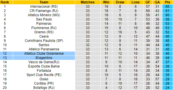 Nhưng khó trách Bragantino, bởi Internacional RS hiện đang chễm trệ ở ngôi đầu. Bên phía đối diện, Atletico GO cũng rất muốn giữ vị trí hiện tại của mình, nhưng xét một cách khách quan, thực lực của Atletico GO không được đánh giá cao như đối phương.