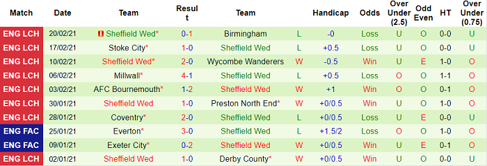 - Thống kê 10 trận gần nhất của Sheffield Wed