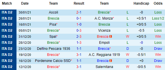 + Thống kê 10 trận gần nhất của Brescia